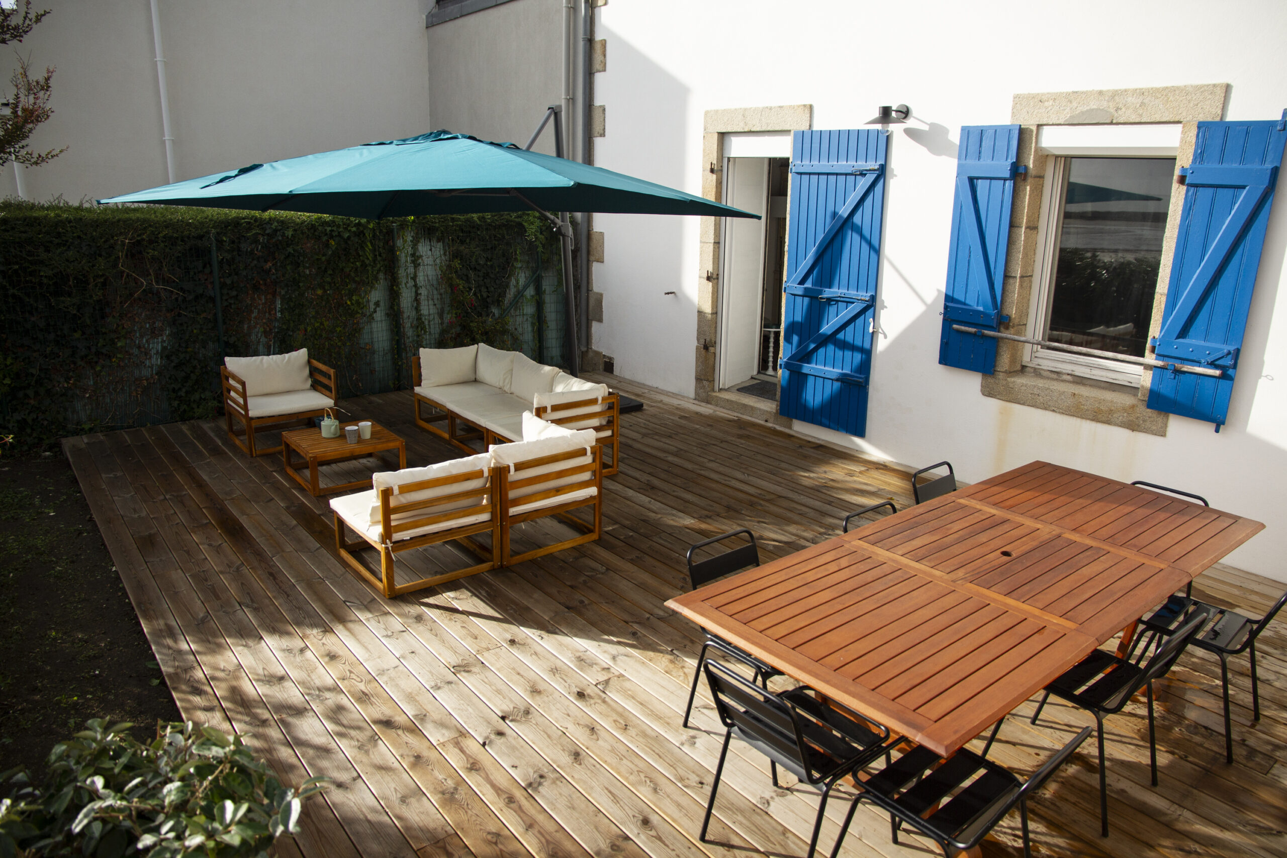 La grande terrasse en bois de 60 m² donne directement sur la plage. Manger en famille, ou passez la soirée entre amis en écoutant les vagues...